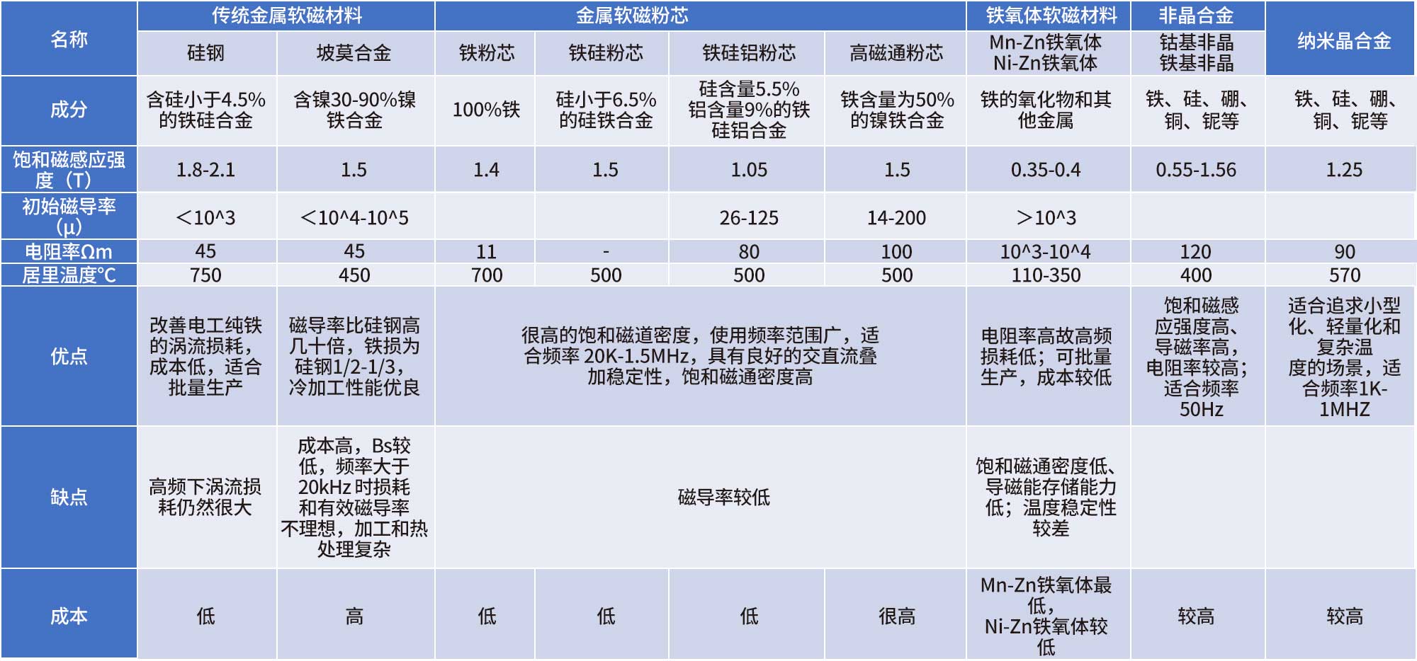 非晶合金种类主要包含铁基、铁镍基、钴基非晶合金。纳米晶超薄带具有高饱和磁度、低矫顽力、高初始磁导、高居里温度率等优势,综合软磁性能优于铁氧体,可缩小磁性器件体积、降低磁性器件损耗、提高效率,可用于共模电感、电子变压器等领域。