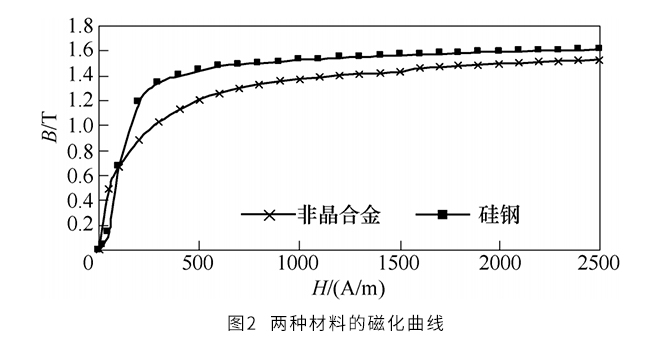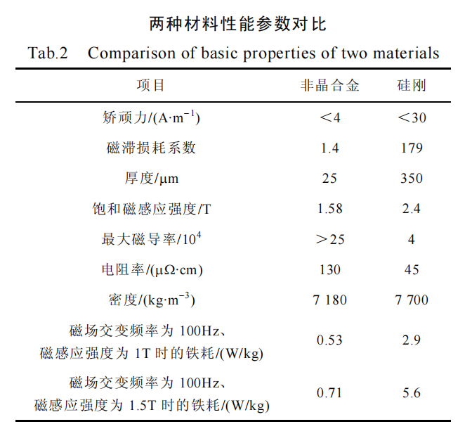 以下分析的两台电机具有相同的结构,选用不同的定子铁心材料,一台采用非晶合金材料,另外一台采用冷轧硅钢片,型号为 DW310−35。两种材料性能参数见下表。