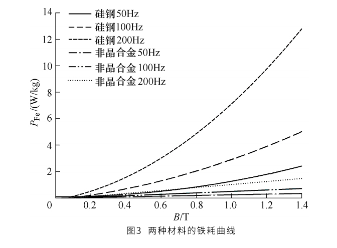 图3 为非晶合金材料和硅钢材料分别在 50Hz、100Hz、200Hz时的铁耗 PFe曲线。