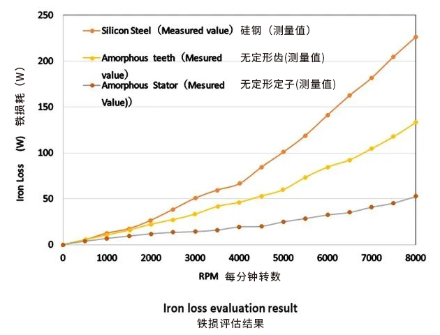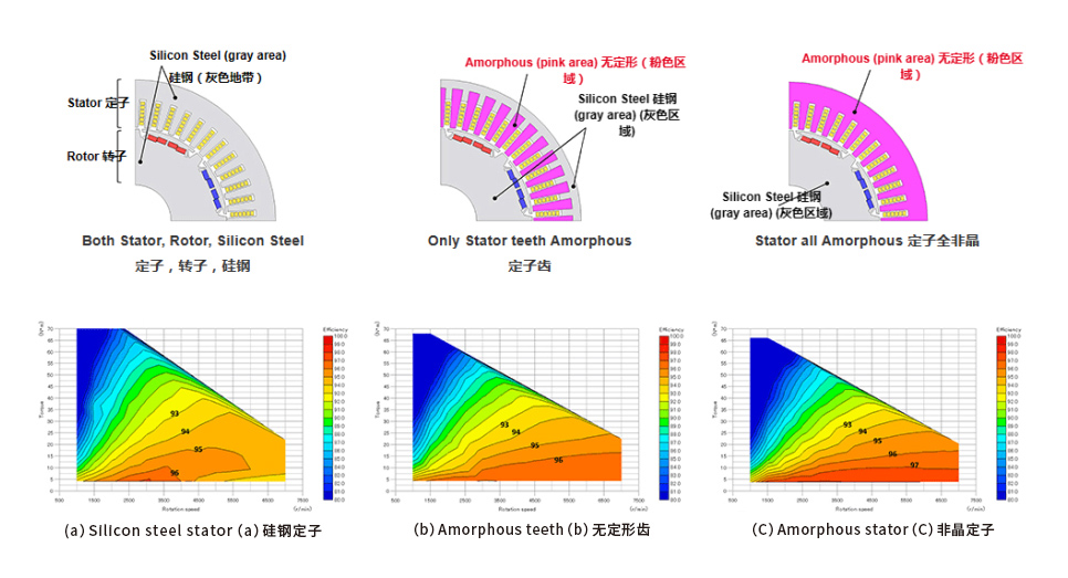 2、在高转速范围内,即使采用非晶合金仅替换(b)中的定子齿,效率也能提高2%或更多。
